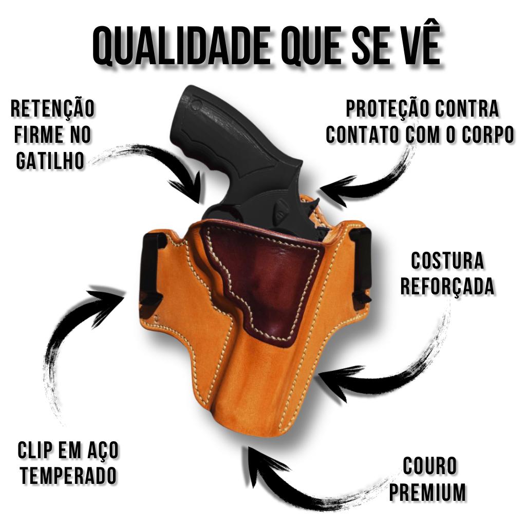 Produzido em couro premium atanado, moldado no modelo da sua arma, ele mantém a arma firme junto ao corpo e permite porte velado confortável durante todo o dia.